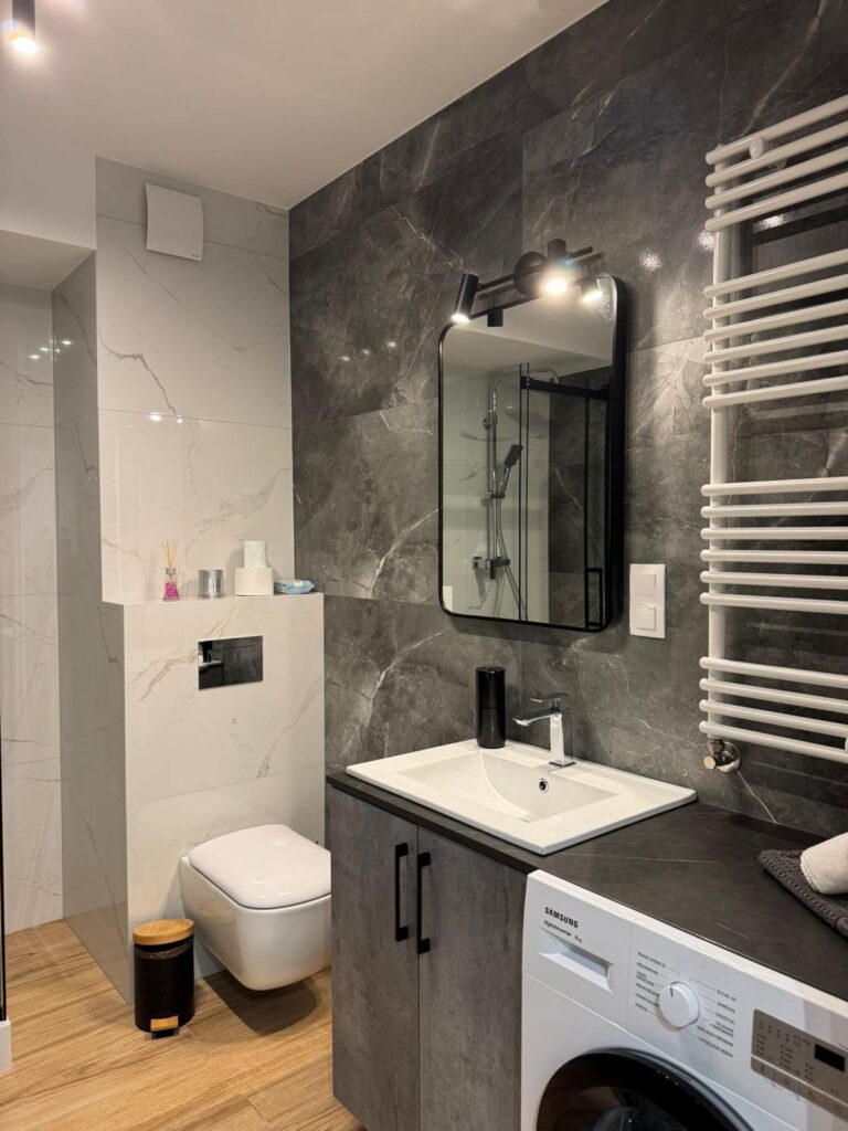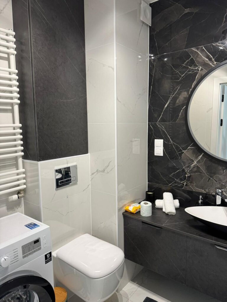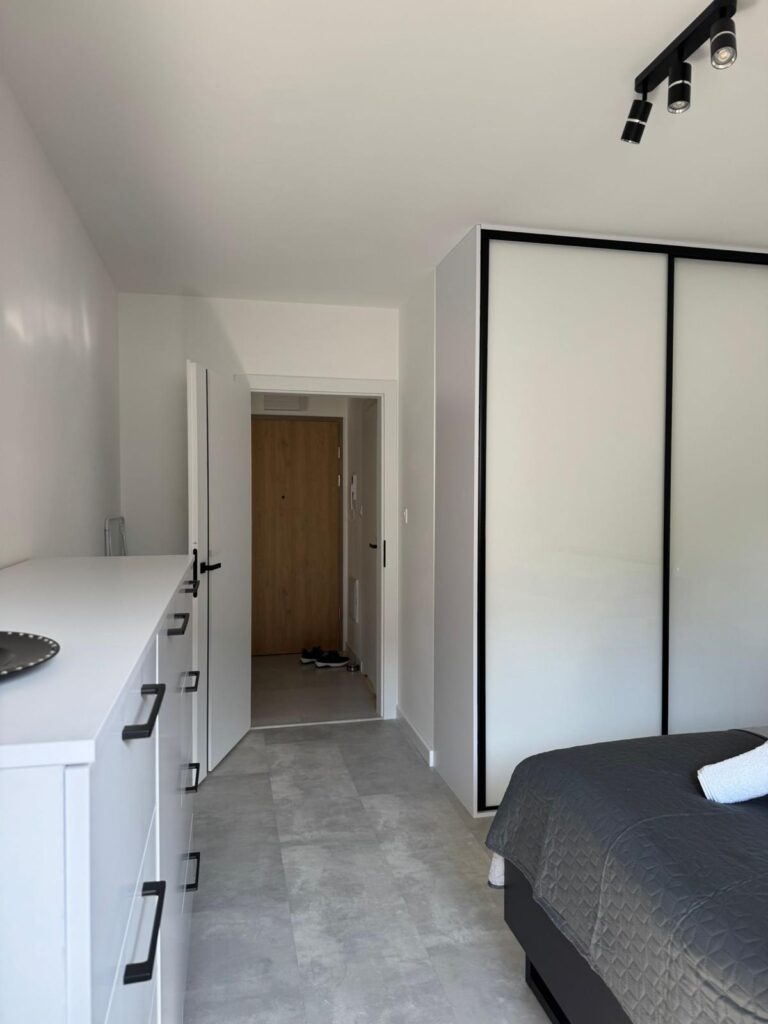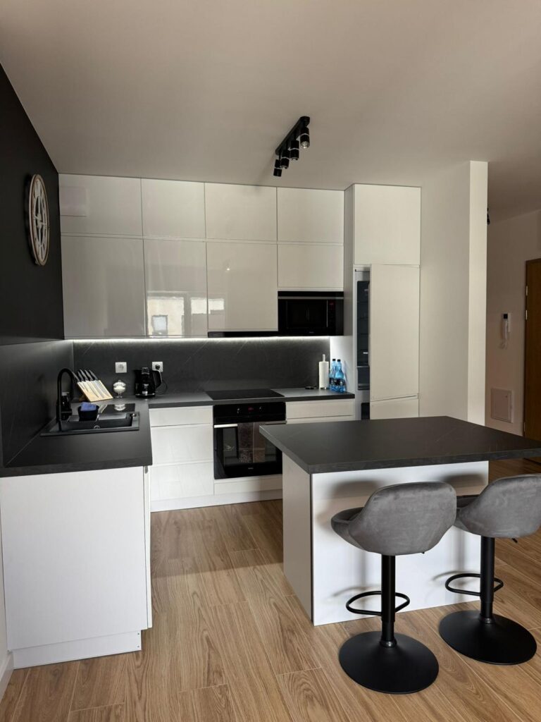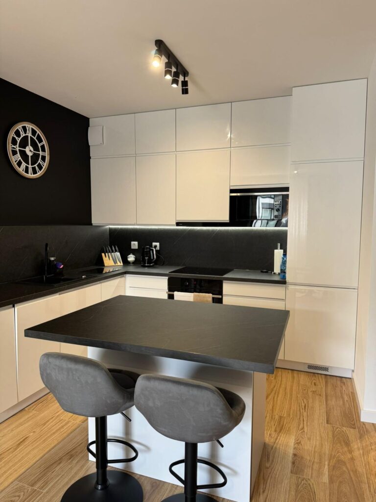 Apartament typu kawalerka został urządzony tak, aby zapewnić pełen komfort zarówno podczas krótkiego, jak i dłuższego pobytu. Na gości czeka nowoczesny aneks kuchenny z pełnym wyposażeniem oraz praktyczne udogodnienia, takie jak zmywarka, pralka czy ekspres do kawy. Do dyspozycji są także świeża pościel, ręczniki oraz sprzęty ułatwiające codzienność – odkurzacz, suszarka do włosów i żelazko.