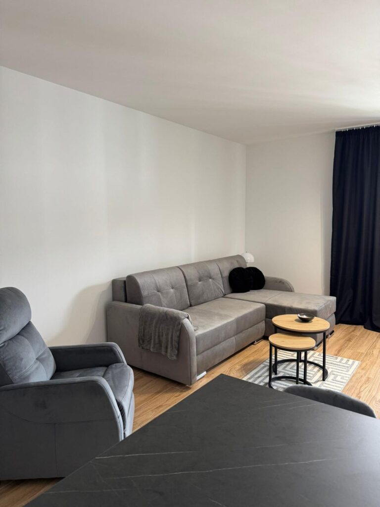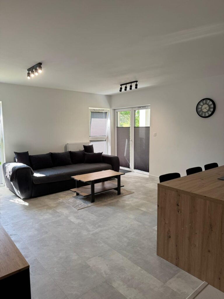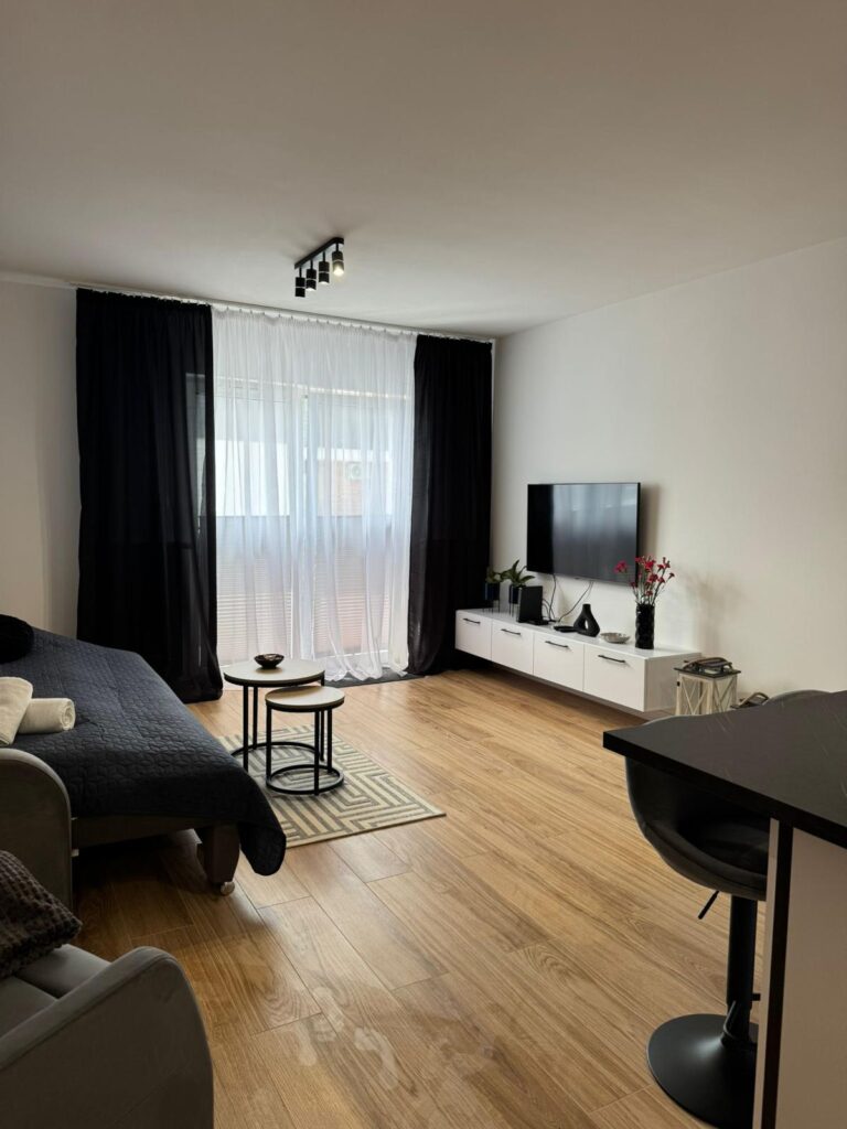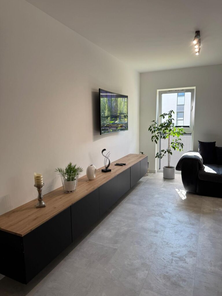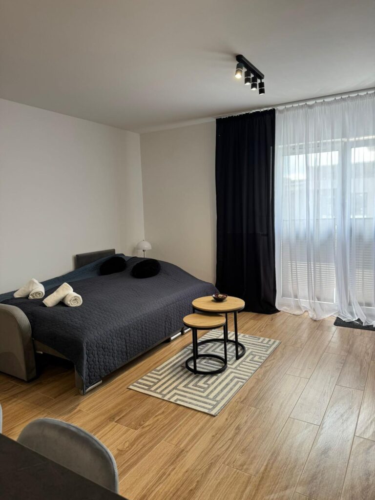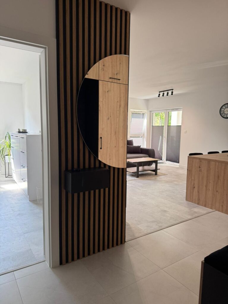 Apartament typu kawalerka został urządzony tak, aby zapewnić pełen komfort zarówno podczas krótkiego, jak i dłuższego pobytu. Na gości czeka nowoczesny aneks kuchenny z pełnym wyposażeniem oraz praktyczne udogodnienia, takie jak zmywarka, pralka czy ekspres do kawy. Do dyspozycji są także świeża pościel, ręczniki oraz sprzęty ułatwiające codzienność – odkurzacz, suszarka do włosów i żelazko.