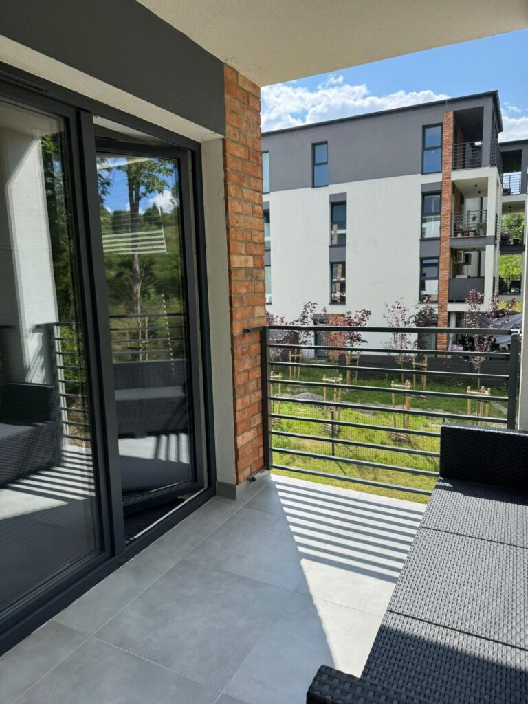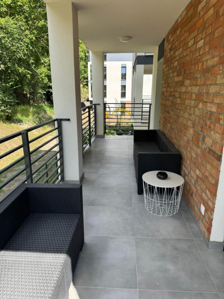 Na tarasie można zrelaksować się przy porannej kawie lub odpocząć po dniu pełnym wrażeń. Apartament wyposażony jest także w szybki światłowód, Smart TV i wideodomofon, co gwarantuje wygodę i bezpieczeństwo.